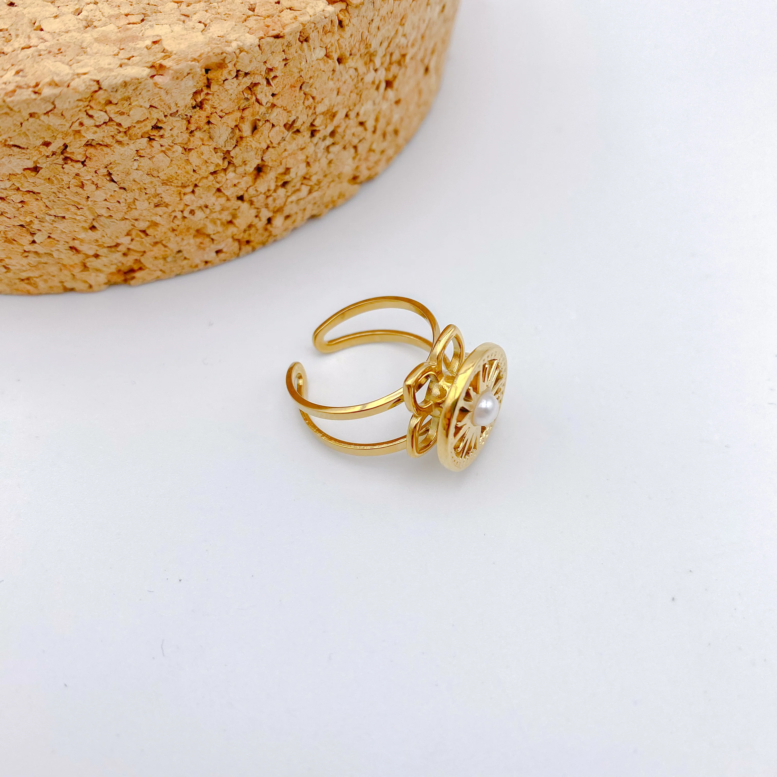 - Anneau effet deux rangs composé d'une fleur et d'un soleil orné d'une perle blanche
