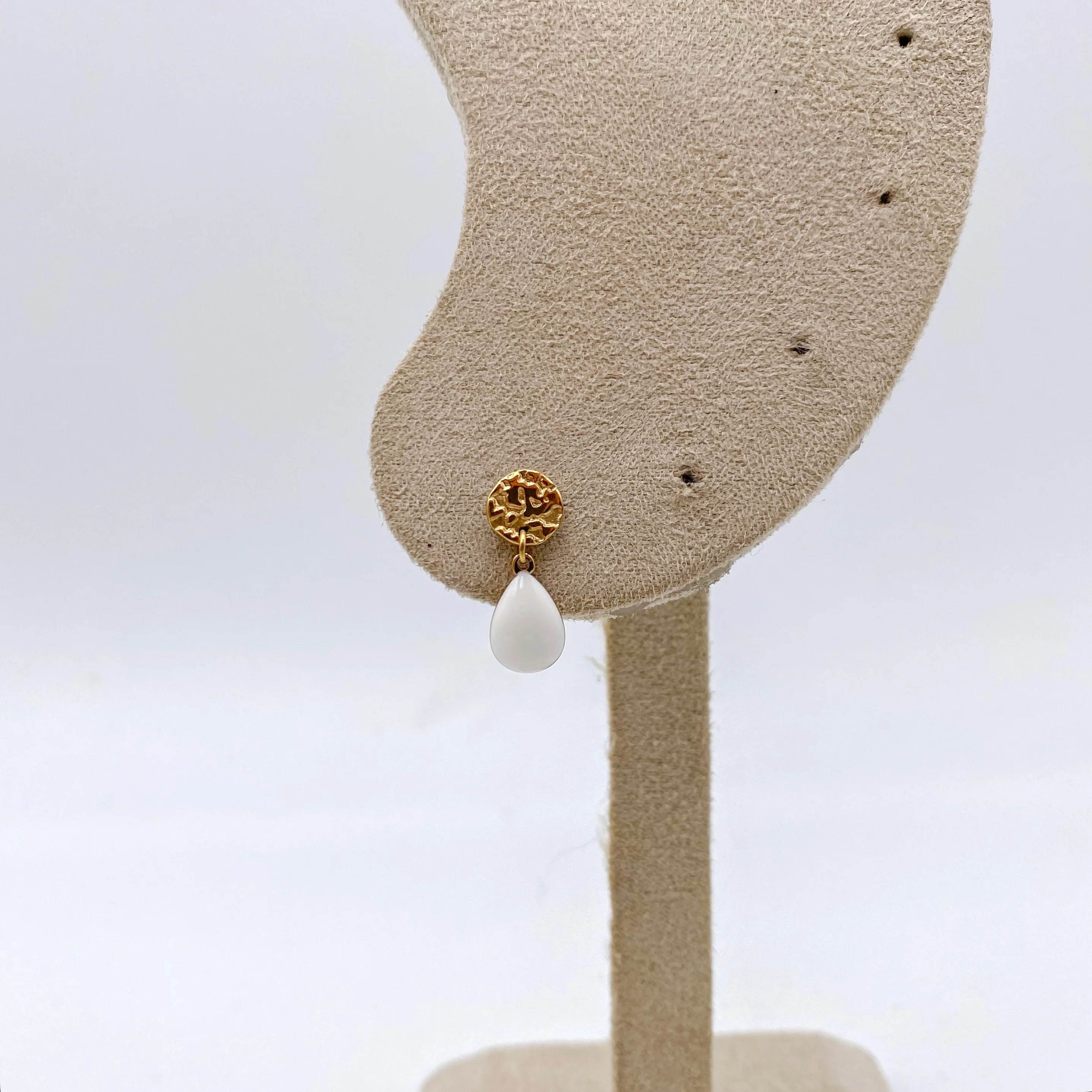- Composées d'une puce effet martelé et d'un pendentif en forme de goutte d'eau orné d'une pastille en résine