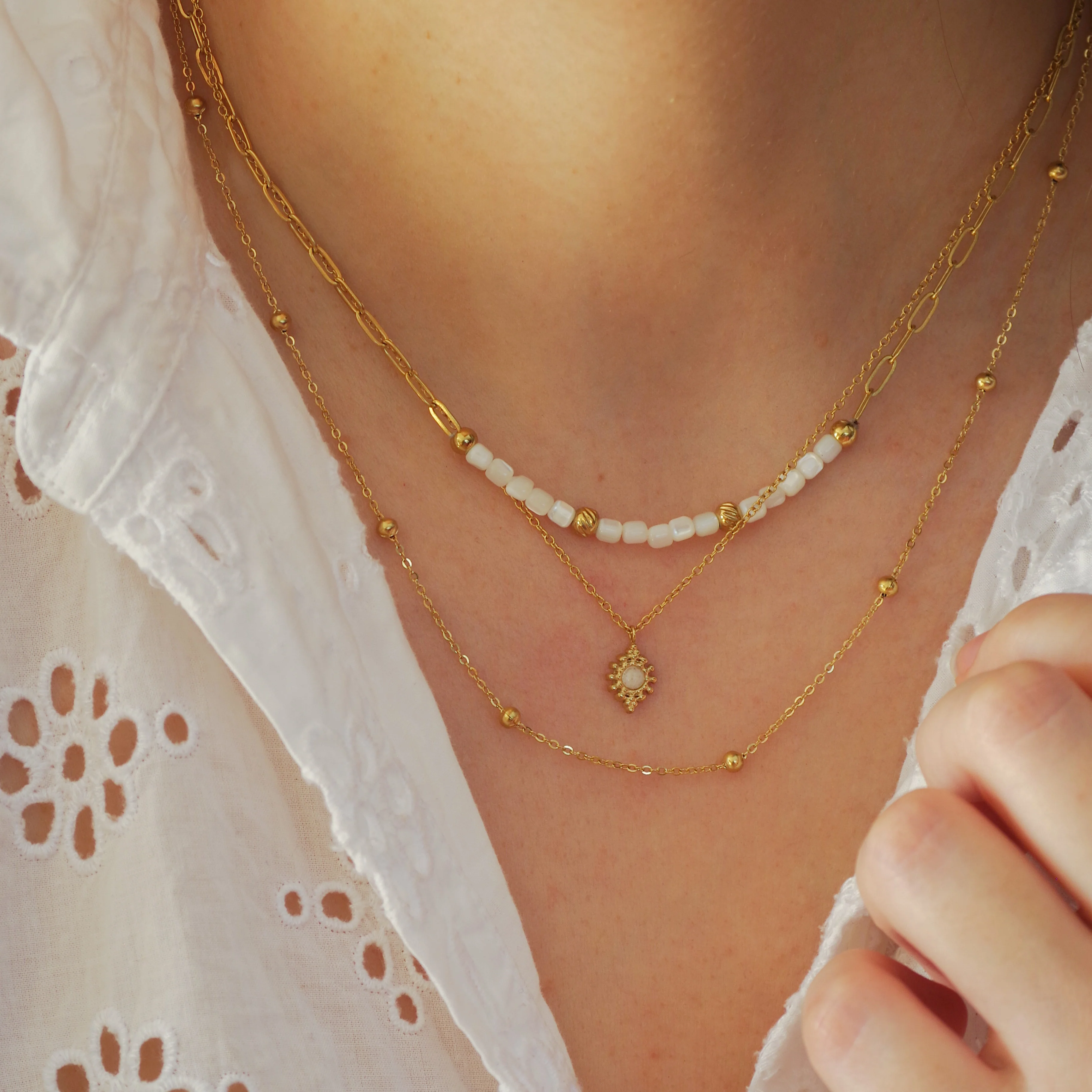- Constitué d'une chaîne boule et d'une chaîne maille allongée ornée d'une rangée de perles naturelles