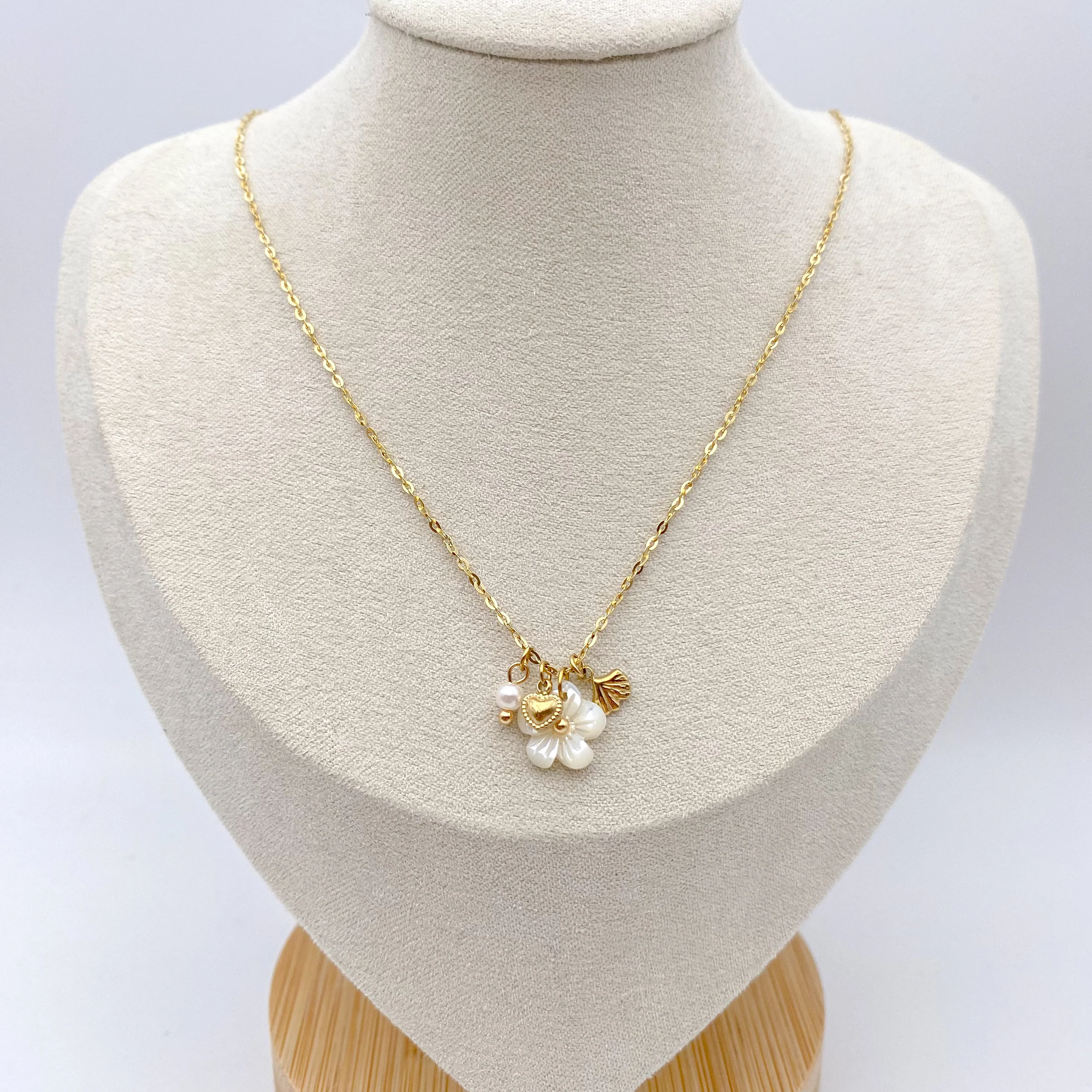 - Chaîne maille composée d'un pendentif fleur nacre et de trois pampilles : un cœur, une perle blanche et une feuille de ginkgo)